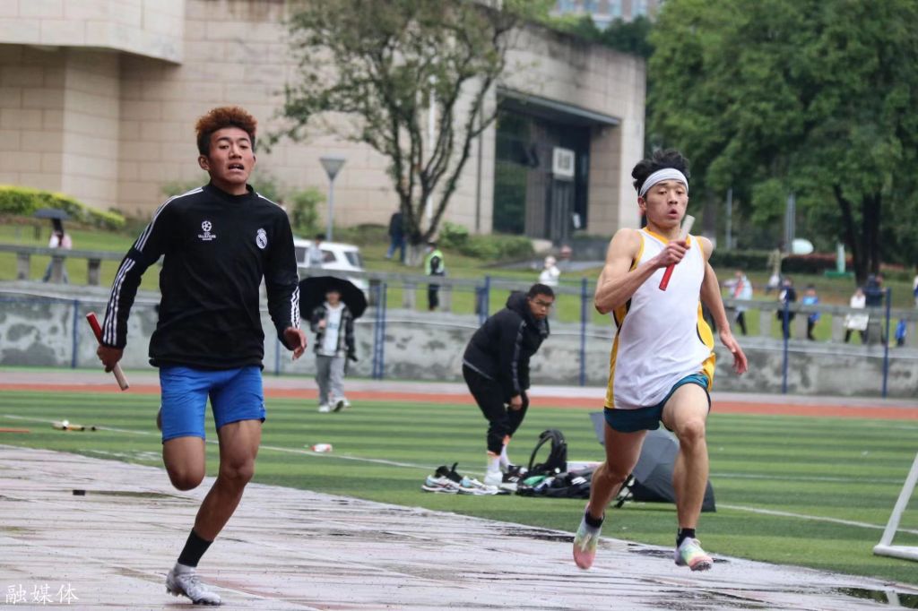 与此同时,在塑胶跑道上,男、女子100米预赛和女子800米决赛正在如火如荼地进行。运动员们精神饱满、斗志昂扬,克服了连绵细雨、跑道湿滑、天气寒冷等困难,用矫健的身姿、坚强的意志展现出了青年的活力,完成了对自我的突破。之后的男子1000米和4×100米中,参赛选手们奋勇拼搏,在赛场上挑战自我,在雨中奋勇争先,跑出了精彩,赛出了风格。