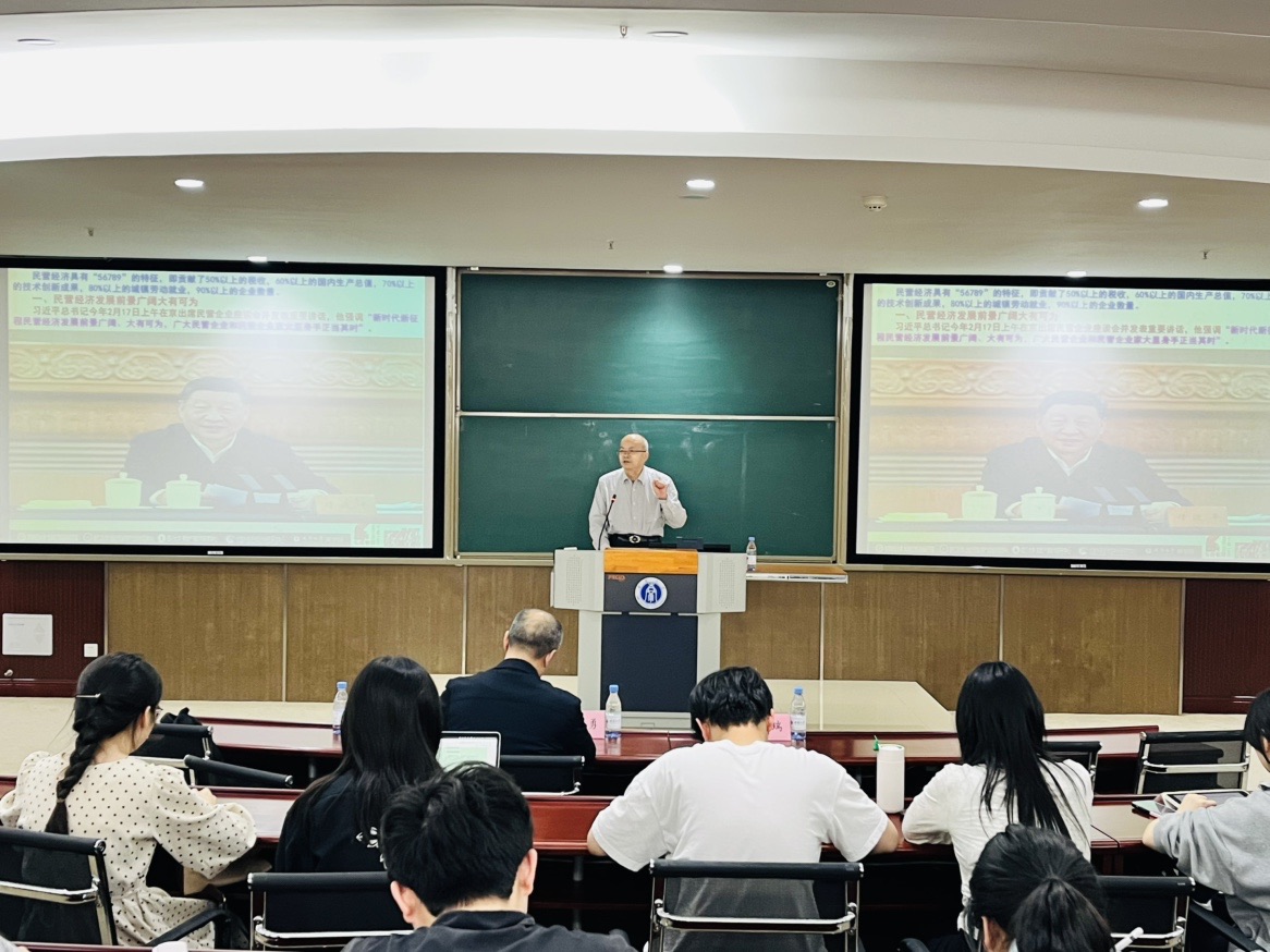 讲座现场气氛热烈,杨继瑞教授以其在区域经济学领域多年的研究成果和丰富经验、深入浅出的讲解让与会师生受益匪浅。他还鼓励更多年轻人投身于民营经济相关领域的研究当中,共同推动该领域的创新发展。此次讲座不仅为参会人员提供了一个高水平的学习交流平台,也为进一步促进成渝地区民营经济的发展和研究奠定了坚实基础,为成渝地区双城经济圈建设贡献了智慧和力量。
