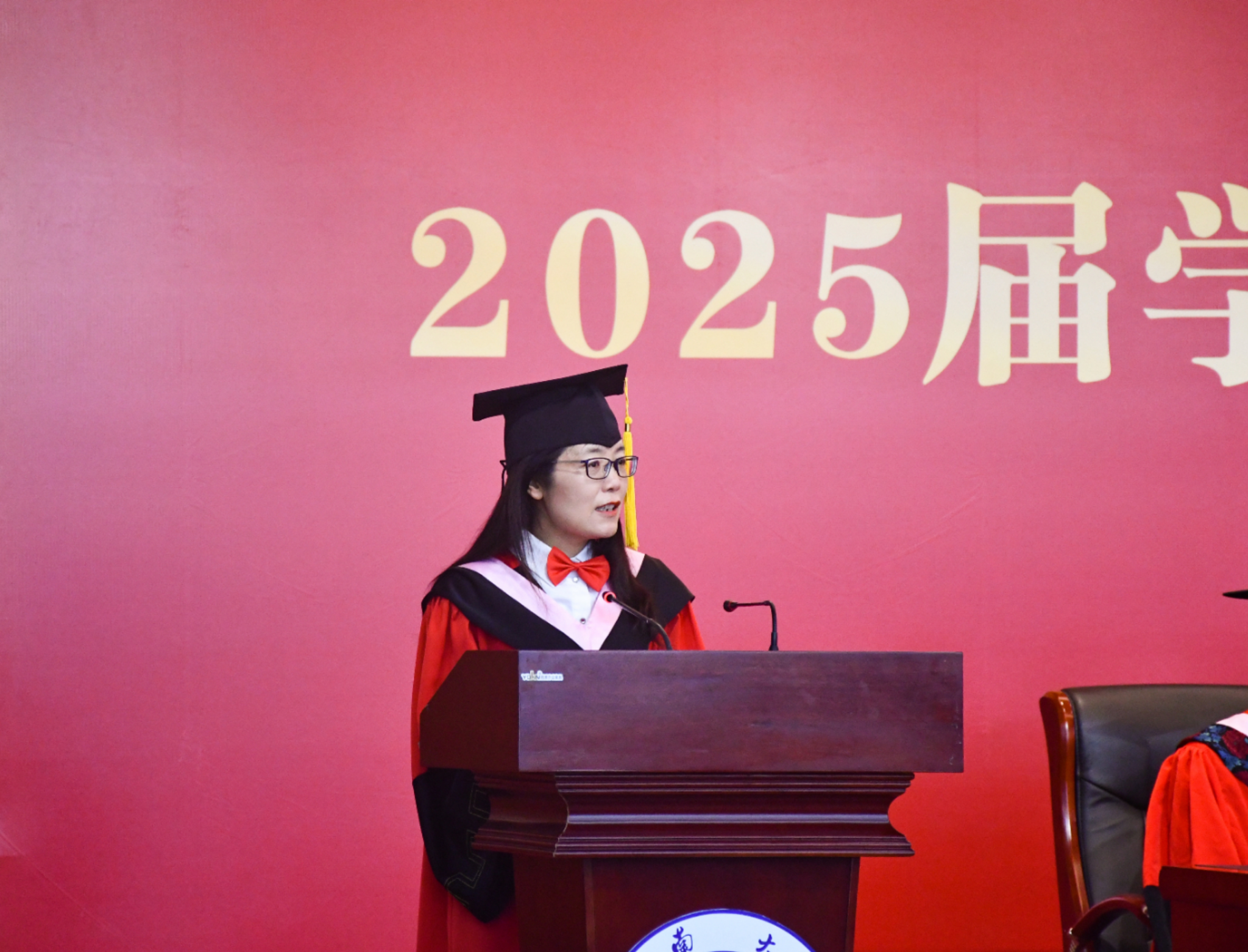 副经理刘新智教授通报公司2025届员工毕业和学位授予情况,主席台领导老师为毕业生代表颁发毕业证书。