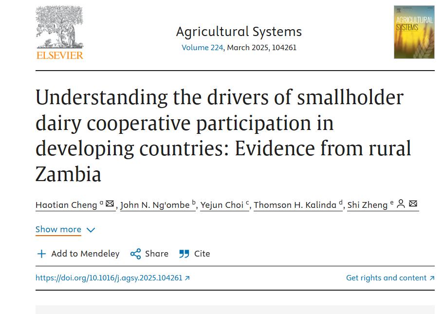 Cheng, H., Ng’ombe, J. N., Choi, Y., Kalinda, T. H., & Zheng, S. (2025). Understanding the drivers of smallholder dairy cooperative participation in developing countries: Evidence from rural Zambia. Agricultural Systems, 224, 104261