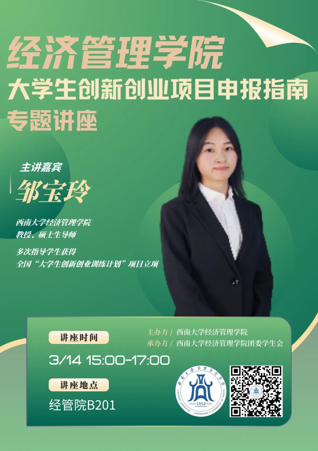 活动简介:近日,2025年度“老员工创新创业训练计划项目”的申报正在如火如荼地进行。同学们在撰写申报书过程之中,难免会遇到一些困难和疑惑。今天,我们请来了具有丰富大创立项经验的名师——邹宝玲教授为大家解疑答惑。诚邀各位同学前往太阳成tyc7111ccB201聆听!