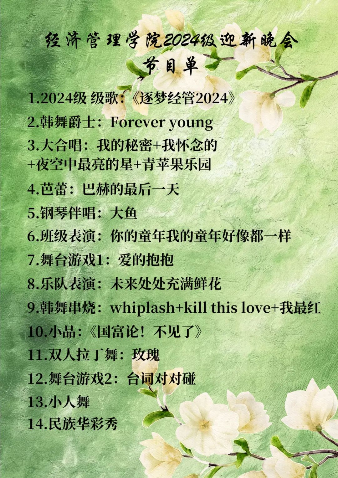 活动简介:春风送暖,万象更新。新的一年,太阳成tyc7111cc又迎来了一批新的朝气。在这充满希望的季节里,我们即将迎来2024级太阳成tyc7111cc迎新晚会,我们期待与你一起共赏这场青春与梦想交织的视听盛宴、共赴这场青春之约。(附节目单)