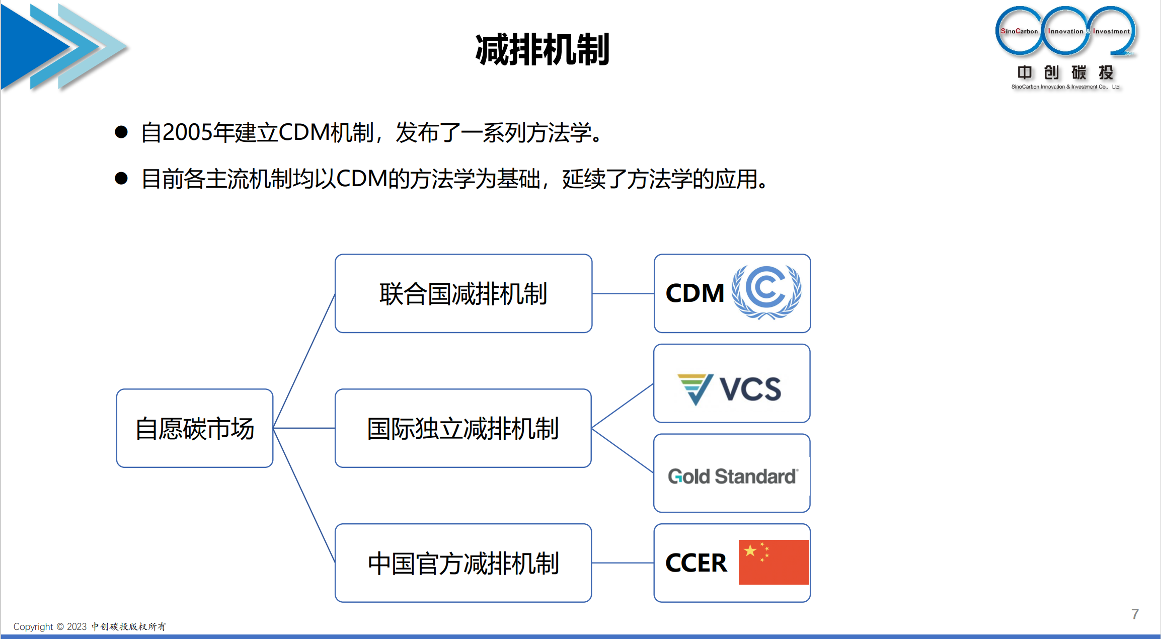 在进一步介绍减排机制时,中国试点碳市场开始之前,是通过联合国减排机制的CDM项目参与到其中的。同时,国际独立减排机制VCS和黄金标准也给我国提供了不少经验,目前在国内比较火的是中国官方减排机制CCER
