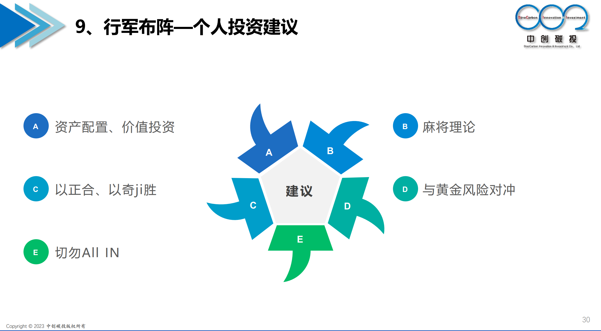 在个人投资方面,周老师提出了五条建议:第一、碳交易是区别于传统股票基金的,总体而言碳市场是帮助国家实现碳减排目标的一个政策市场。第二、麻将理论:正如打麻将不可能每一个人都赢钱,应该深入研究碳理论、碳政策,从而提高增加收益的可能性。第三、以正合、以奇胜,即应该做长线投资。第四、需要注意类似战争这类因素带来的黄金风险对冲。第五、不要有赌徒心态,不要ALL IN