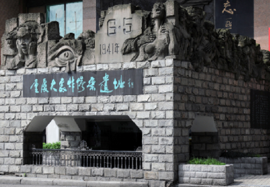 抗日战争时期,1937年至1938年上海、南京、武汉相继被侵华日军占领,“国民政府"沿长江节节败退至重庆。此后,重庆不仅成为"国民政府"的陪都及政治、军事、文化中心,而且成为日军实施"以炸迫降"战略企图最主要的空袭目标。据不完全统计,大轰炸期间,重庆直接人口伤亡超过4万,财产损失超过100亿元(折合1937年法币)。历史的伤痕还在,历史的教训还在。重庆市民防办在渝中区瓷器街设立了重庆大轰炸惨案遗址纪念设施,遗址屋顶,是一圈拥挤的人物雕塑,人物双目圆睁,双手抓破衣服,扯裂喉咙,撕心裂肺般张口吐舌,这表现的便是“六五”大隧道惨案中的惨状。