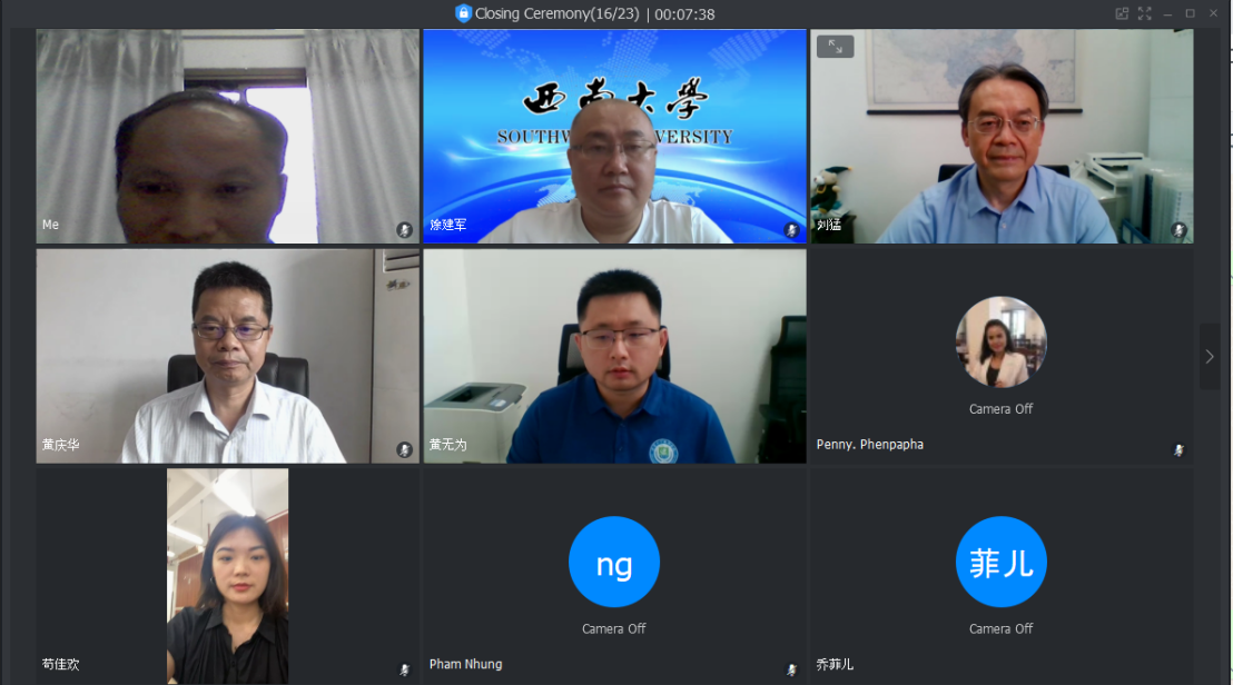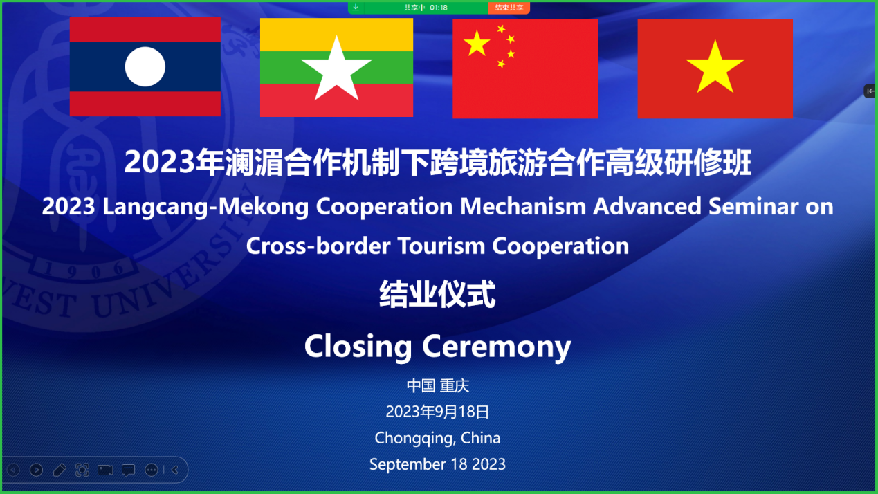9月18日下午,由国际公司和太阳成tyc7111cc联合申报的重庆市长奖学金丝路项目——“澜湄合作机制下跨境旅游合作高级研修班”结业仪式在线举行。国际公司党委书记刘猛、太阳成tyc7111cc副经理黄庆华、项目教学班主任涂建军教授、太阳成tyc7111cc高层培训中心苟佳欢和邓小力,以及19位来自澜湄国家文化旅游相关部门、机构及企业的学员参加仪式。仪式由国际公司外国员工招生办主任黄无为主持。