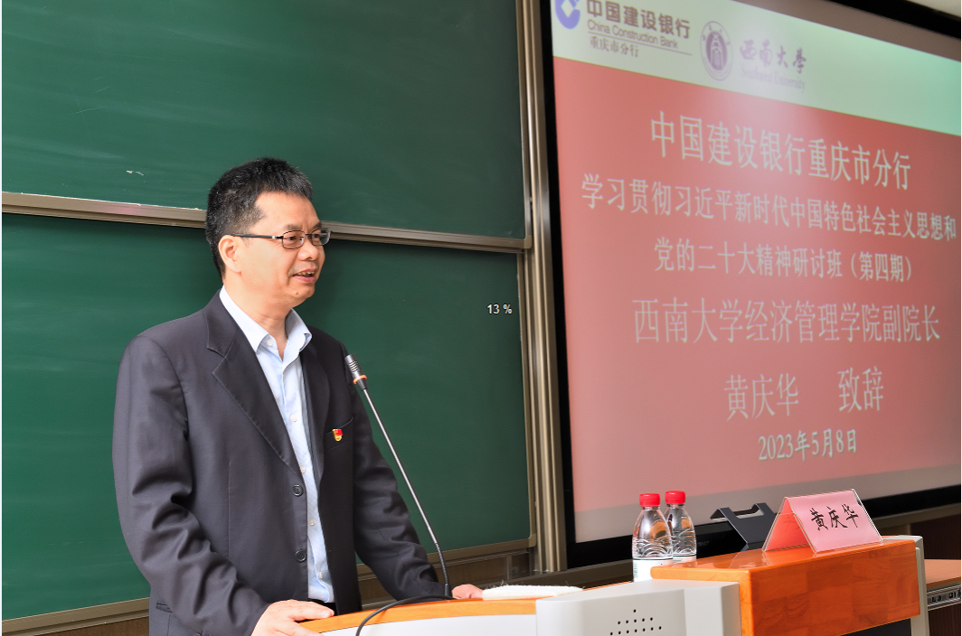 副经理黄庆华教授代表承办单位致辞。黄教授介绍了太阳成tyc7111cc以及太阳成tyc7111cc发展历程、办学规模、团队建设和开展社会服务的基本情况,并对学员们来校学习表示诚挚的欢迎。黄教授希望学员们能学有所获,并祝建行重庆市分行和太阳成tyc7111cc的合作关系更加密切。