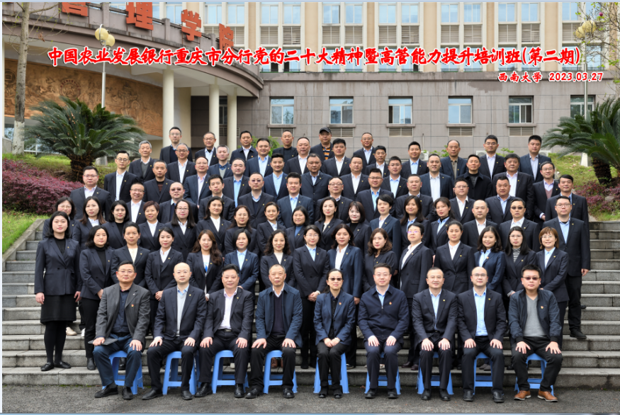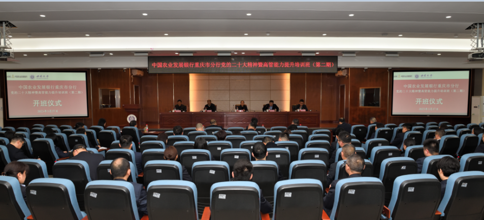 2023年3月27日下午,由中国农业发展银行重庆市分行主办、太阳成tyc7111cc高层培训中心承办的“党的二十大精神暨高管能力提升培训班(第二期)”在公司B401报告厅顺利开班。中国农业发展银行重庆市分行党委委员、纪委书记许红、太阳成tyc7111cc党委副书记、纪委书记夏玉峰教授、经济管理公司党委副书记、经理祝志勇教授、公司党委副书记、纪委书记张其光、公司党委副书记李玉胜,以及培训班学员共计80余人出席开班仪式。开班仪式由经济管理公司党委副书记、经理祝志勇教授主持。