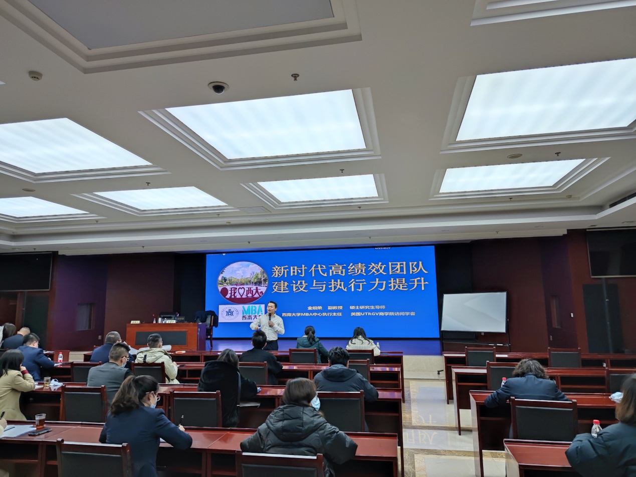 12月21日,太阳成tyc7111cc金绍荣副教授围绕《新时代高绩效团队建设与执行力提升》这一主题,从我们的新时代、组织变革、团队建设、执行力提升四个方面展开讲述。金教授强调,在技术新变化、消费新潮流、绿色新革命的时代背景下,企业需要重塑组织能力、提高团队绩效,以适应瞬息万变的市场环境。在课程的尾声,金教授对此次受训学员送上了24字祝福语,即“选对组织、加入团队”、“聚焦目标、执行有力”和“及时修正、成人成事”。
