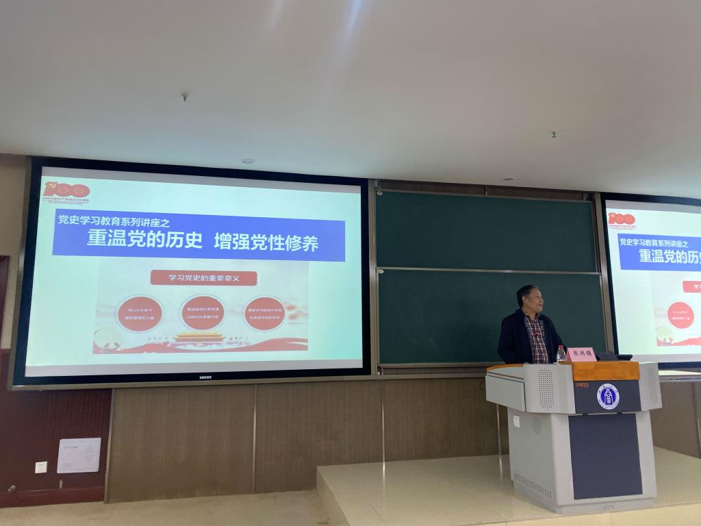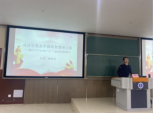 下午,唐棣宣副教授围绕《从百年党史中汲取智慧和力量——兼论习近平总书记“七一”重要讲话精神解读》这一主题,从“新民主主义革命时期(1921-1949)”、“社会主义革命和建设时期(1949-1978)”、“改革开放和社会主义现代化建设时期(1978-2012)”、“中国特色社会主义新时代(2012-至今)”四个方面展开讲述。中国共产党的百年历史告诫我们要坚持中国共产党的领导,以史为鉴,开创未来,实现中华民族的伟大复兴。