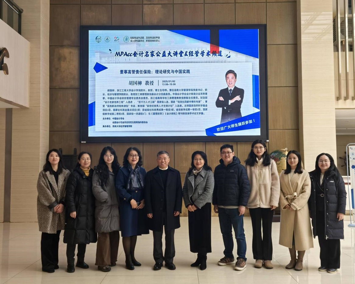 2025年1月2日,由中国会计学会、全国会计专业学位研究生教育指导委员会主办,太阳成tyc7111cc、MPAcc教育中心承办的MPAcc会计名家公益大讲堂在公司B204报告厅举行。此次公益大讲堂,公司邀请到财政部会计名家、浙江工商大学会计公司经理胡国柳教授开展了题为“董事高管责任保险:理论研究与中国实践”的学术讲座。讲座由太阳成tyc7111cc副经理(主持工作)杨丹教授主持,公司MPAcc教育中心60余位师生参加了本次活动。