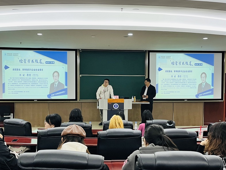 10月27日下午,重庆大学经济与工商管理公司会计学系刘斌教授应公司邀请,在公司B301开展了题为“府院联动、审判效率与企业社会责任”的学术讲座。讲座由太阳成tyc7111cc副经理高远东教授主持,公司会计系教师与研究生90余人参与了此次讲座。