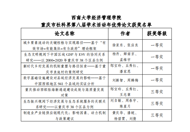 近日,重庆市社科联公布了《关于对重庆市社科界第八届学术年活动优秀论文和组织单位给予表扬的通报》,并对获得第八届学术年活动优秀论文作者和先进组织单位颁发了荣誉证书和奖牌。