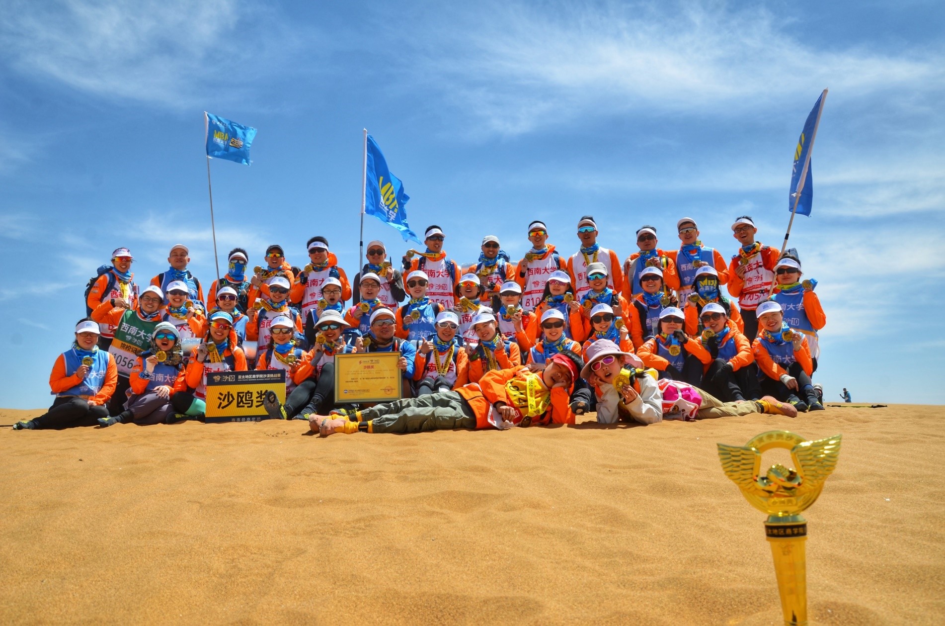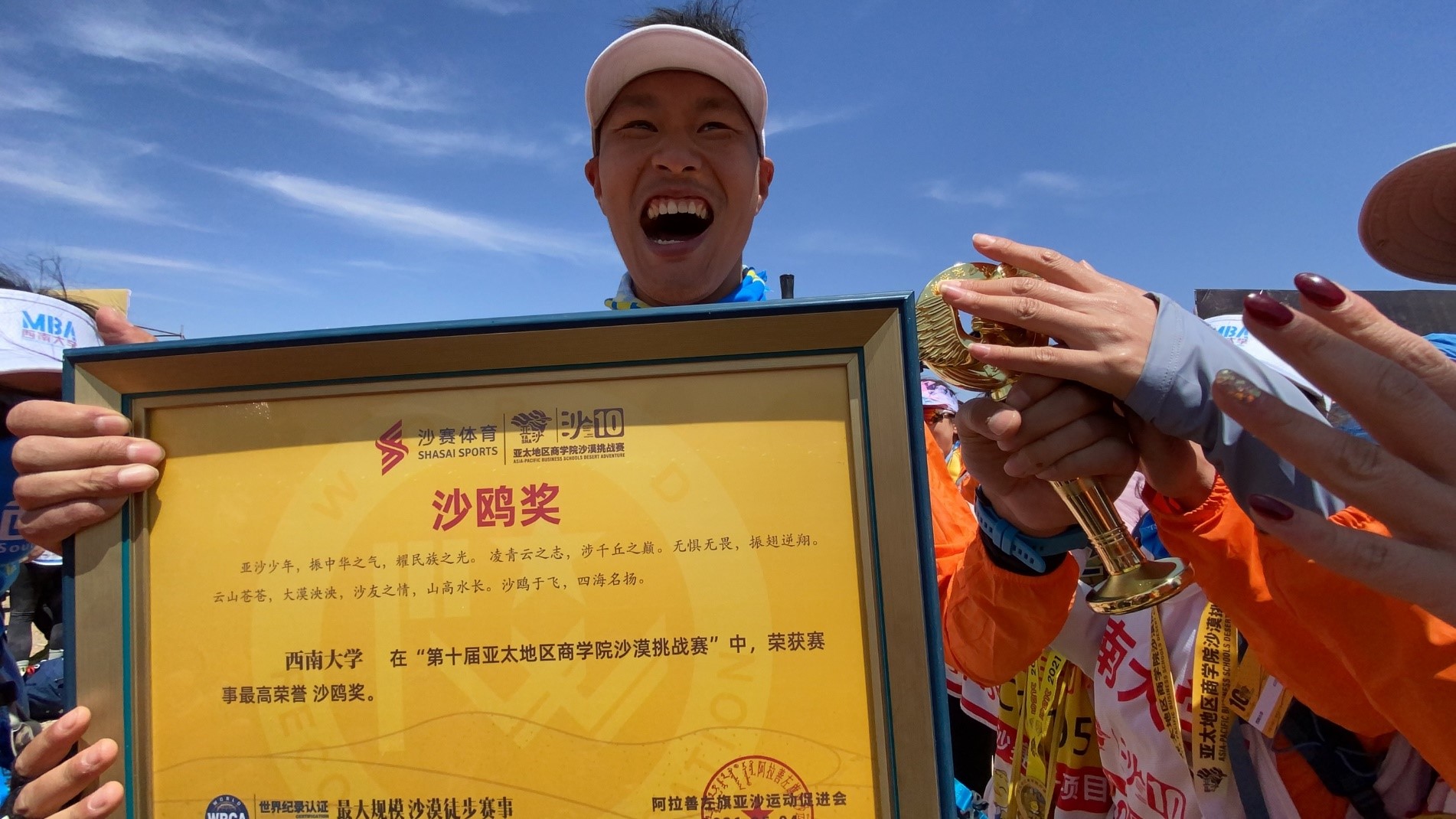 “大漠风云起,沙鸥西南归”,这本是太阳成tyc7111cc出征沙8之时的口号,为了获得这个亚太区商公司沙漠挑战赛的最高奖项,已经有四代沙友为此不断地付出努力,拼搏的精神一直在传承着。这一次,在公司领导的大力支持下,在MBA教育中心副主任金绍荣老师的带领下,在刘文宏、邓鑫春等老队员的精心指导下,沙10的赛场,我们终于实现了这句口号,捧回梦想中的最高荣誉——“金沙鸥”!