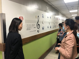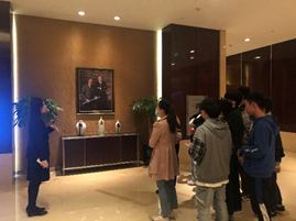 图1 酒店主管为同学们介绍马里奥特酒店集团 图2 同学们参观JW万豪酒店的文化墙