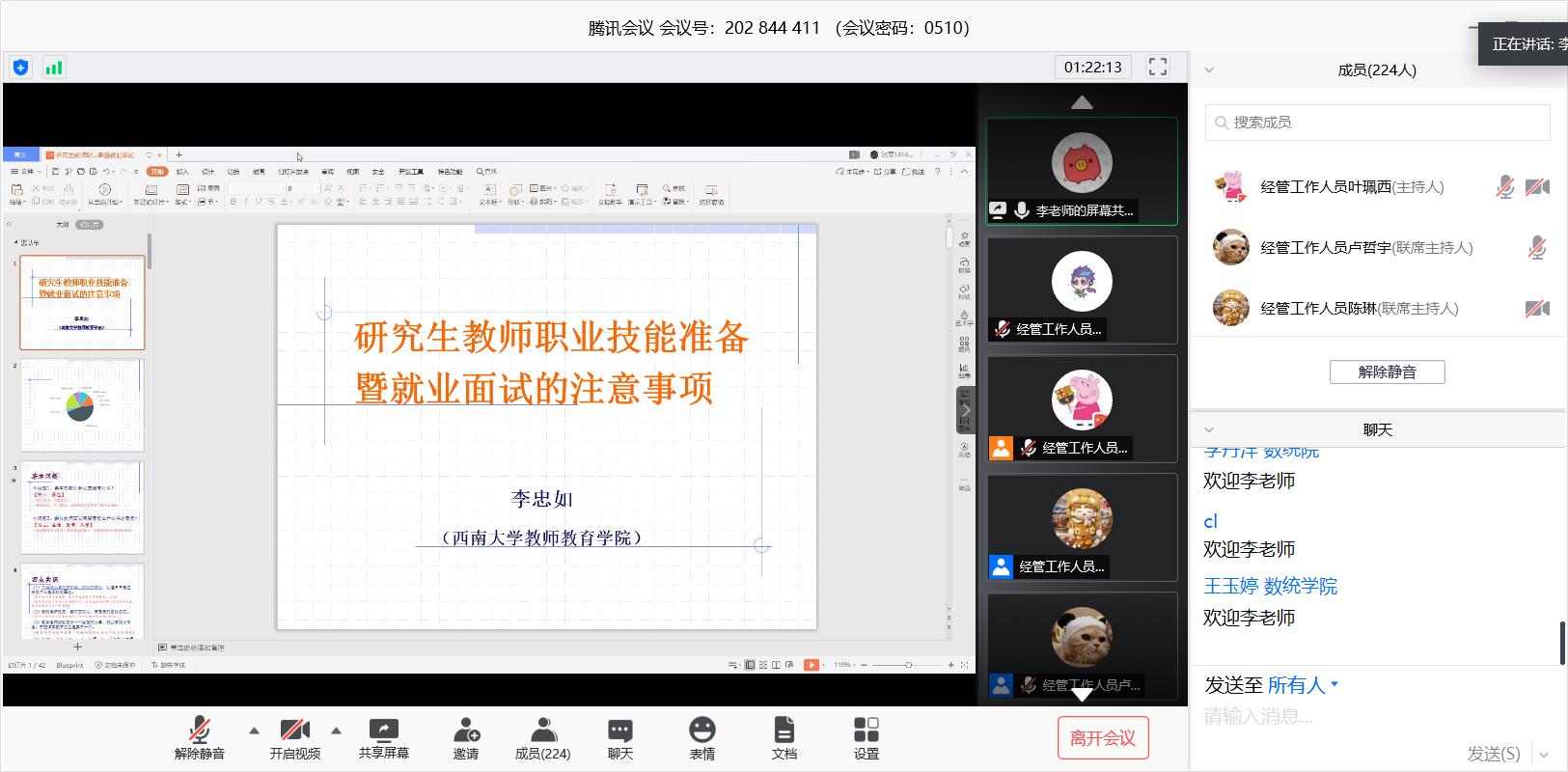 李忠如演讲主题为研究生教师职业技能准备暨就业面试注意事项,李老师讲述教师必备的基本能力并强调人民教师的基本素质——自信、激情以及热爱,他从专业理念与师德、专业知识和专业能力三个维度介绍了教师专业标准的基本内容,提出61项基本要求对教学设计与教学实施两个领域进行了详细讲述,并提出相应的方法对策。