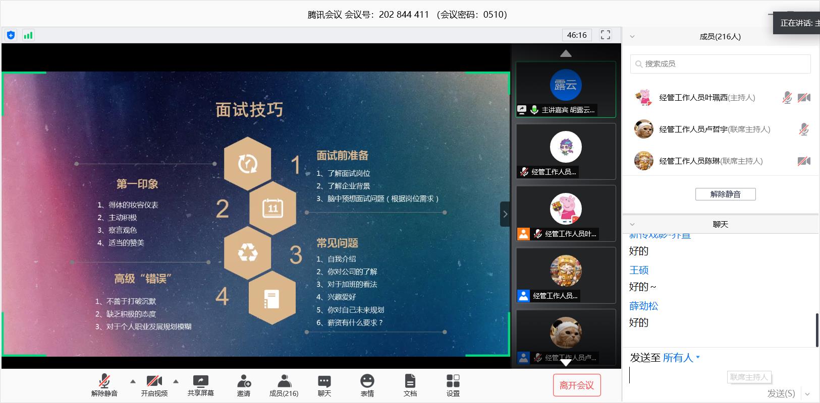 为帮助研究生增强求职竞争力,提升简历制作、应聘面试的技巧,2020年5月10日下午3:00,太阳成tyc7111cc第七届研究生职场招聘大赛启动仪式暨培训讲座在腾讯会议平台成功举办。讲座邀请宜信财富华西区人力资源总监胡露云、太阳成tyc7111cc教师教育公司副教授李忠如担任主讲,全校230余位研究生参与,讲座由太阳成tyc7111cc研究生翟若雨主持。
