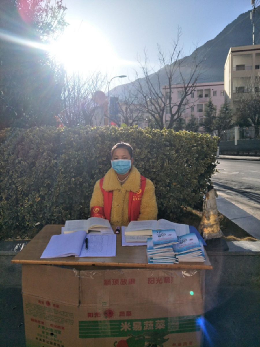 2016级的任丽钰同学,是支部委员和年级员工干部。社区实行管控后,她第一时间向芙蓉社区党支部报到,主动承担入户疫情防控宣传和社区卡点岗位值班工作。主要承担对本社区人员和车辆实名登记、消毒和检查,对外地返回人员掌握活动轨迹进行居家隔离、上报及政策宣传等任务。入户宣传需要耐心,检查登记要做到严格细致,忙到错过饭点是经常的事。作为一名少数民族党员,任丽钰说“一名党员就是一面旗帜,每次执行工作任务我都戴着党徽,我要让党旗飘扬在我们阿坝州小县城抗疫的第一线”。