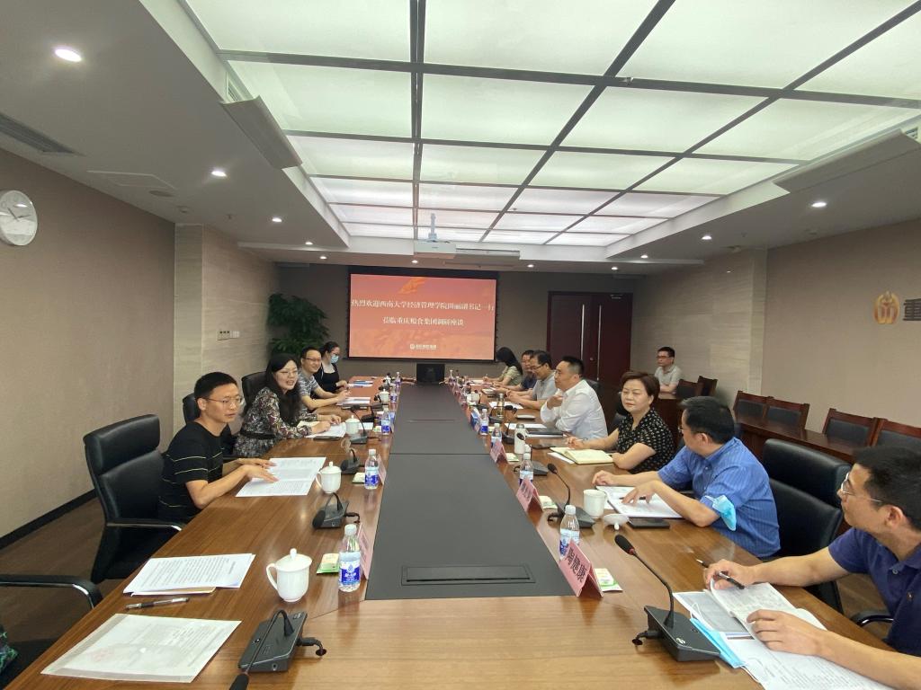 为贯彻教育部和公司访企拓岗促就业专项行动要求,全面深化校企合作、供需对接,更好地了解用人单位对人才的需求,全力促进毕业生更加充分更高质量就业。5月12日上午,公司党委副书记田丽、农林经济管理系党支部书记兼副系主任孔立、农业硕士中心主任尹朝静、组织员钱璐、研究生辅导员任娟等一行前往重庆粮食集团有限公司进行走访调研。重庆粮食集团党委副书记、总经理胡朝斌,集团党委副书记、工会主席汪云文,集团办公室主任杨垚,集团人力资源部副部长陶健康,集团发展改革部副部长张淑蓉,凯欣粮油有限公司党委书记、董事长王彦,重庆市粮油批发市场有限责任公司党支部书记、董事长、国家粮食重庆交易中心主任谭光荣等出席。