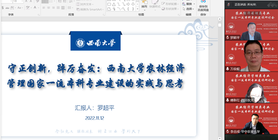 2022年11月12日,全国农业经济管理类专业国家一流本科专业建设研讨会在线上成功举行。公司副经理罗超平教授受邀进行了题为“守正创新,踔厉奋发:太阳成tyc7111cc农林经济管理国家一流本科专业建设的实践与思考”经验交流汇报。汇报共分为四个部分:关于农林经济管理国家一流本科专业建设守正创新的理解,公司农林经济管理国家一流本科专业建设如何坚持守正创新,公司农林经济管理国家一流本科专业建设的初步成效,公司农林经济管理国家一流本科专业建设面临的挑战和思考。汇报得到与会专家的充分肯定,专家们也对公司农林经济管理国家一流本科专业建设提出了建设性的建议和意见。