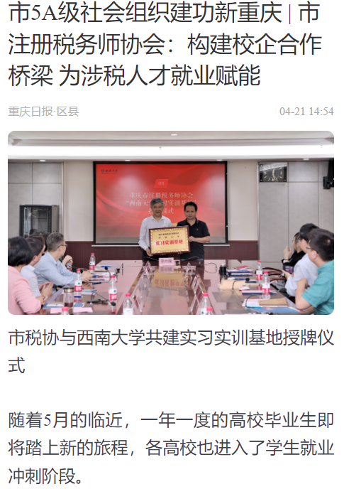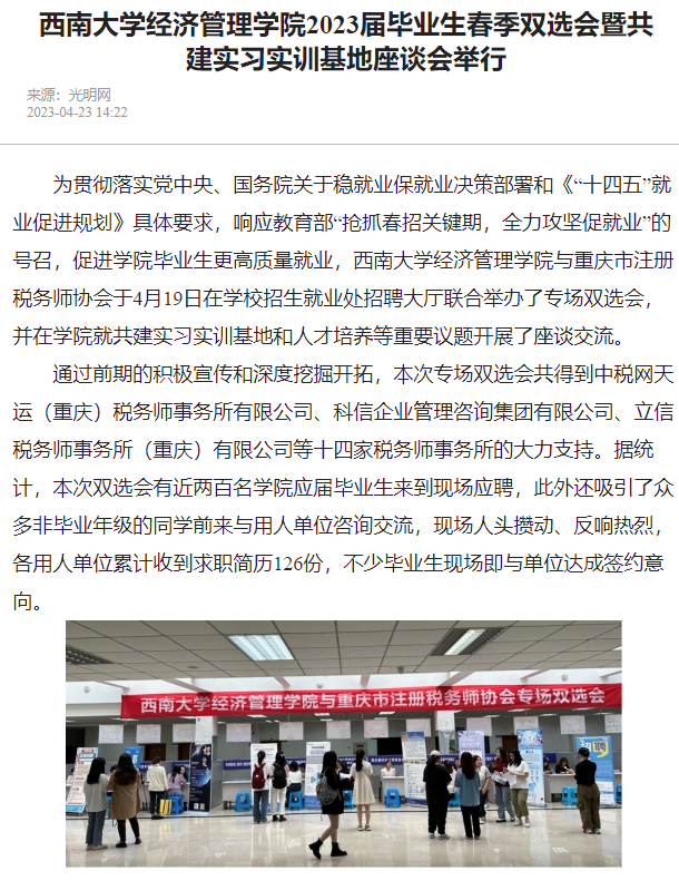 近日,公司与重庆市注册税务师协会联合举办了专场双选会,并在公司就共建实习实训基地和人才培养等重要议题开展了座谈交流。光明网、中国经济网、中国青年报、新浪新闻、重庆日报和重庆晨报等媒体分别以《太阳成tyc7111cc2023届毕业生春季双选会暨共建实习实训基地座谈会举行》《构建校企合作桥梁 为涉税人才就业赋能》《院企共筑就业桥梁 合作描绘广阔前景》为题,报道公司举办2023届毕业生春季双选会暨共建实习实训基地座谈会。