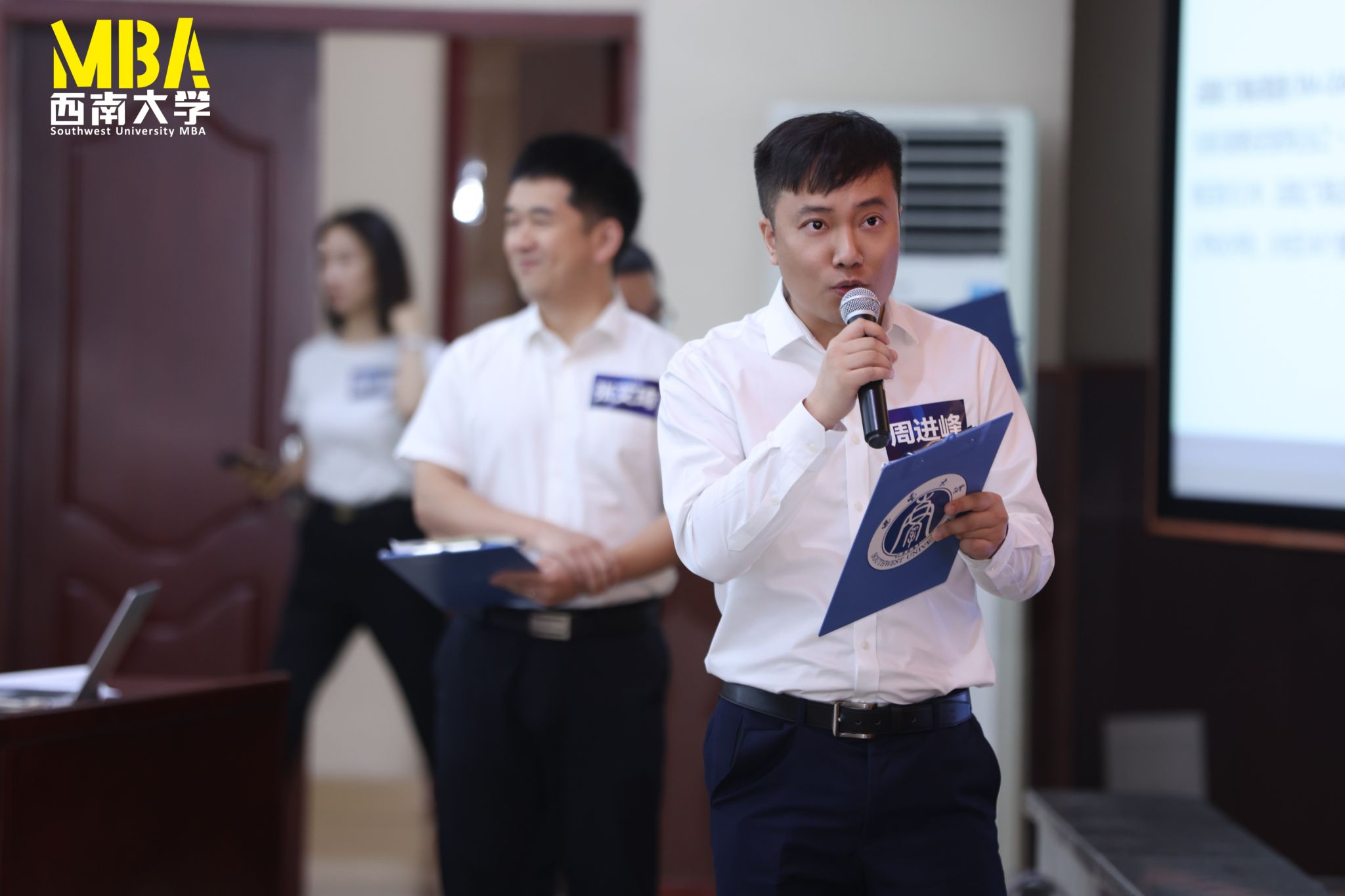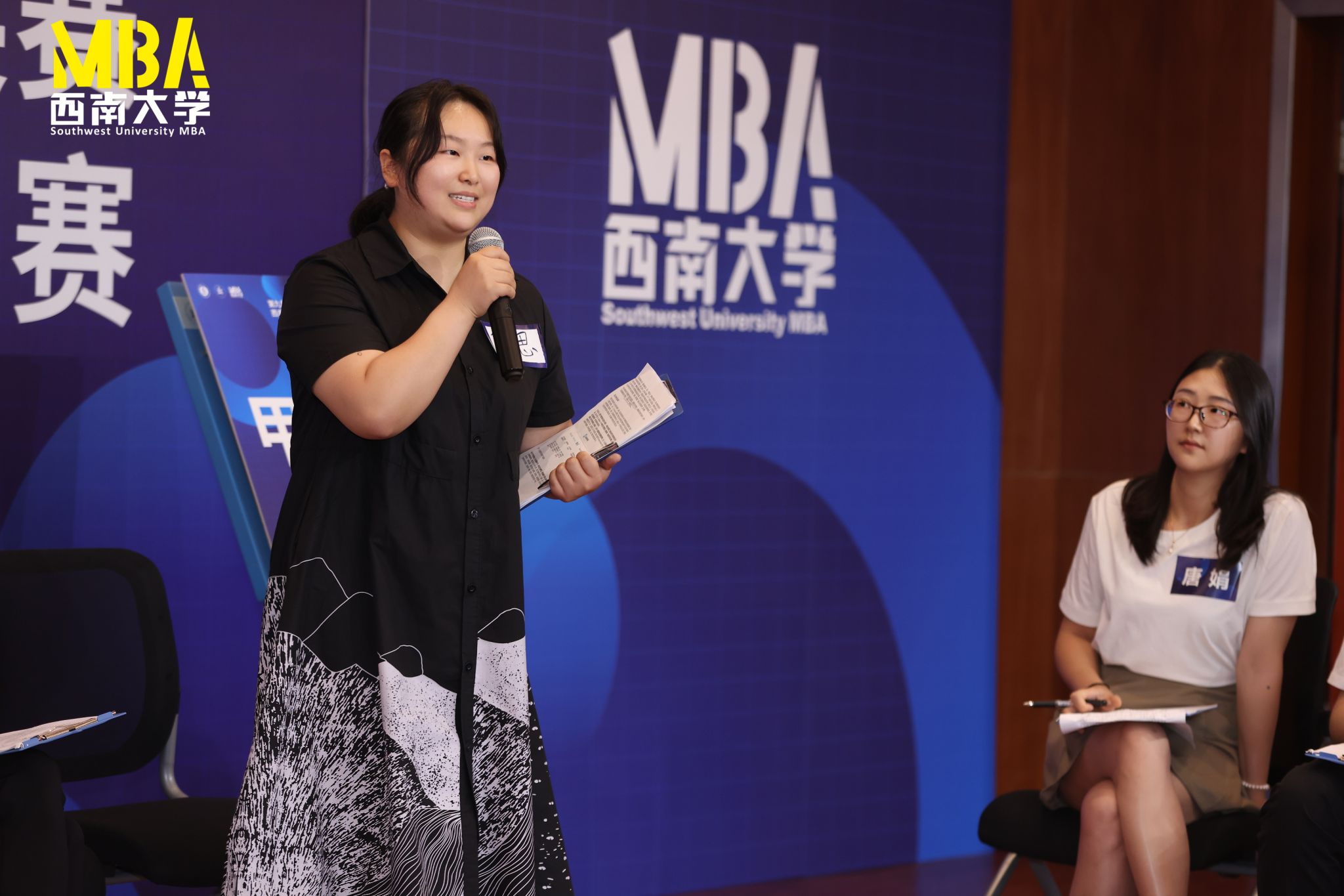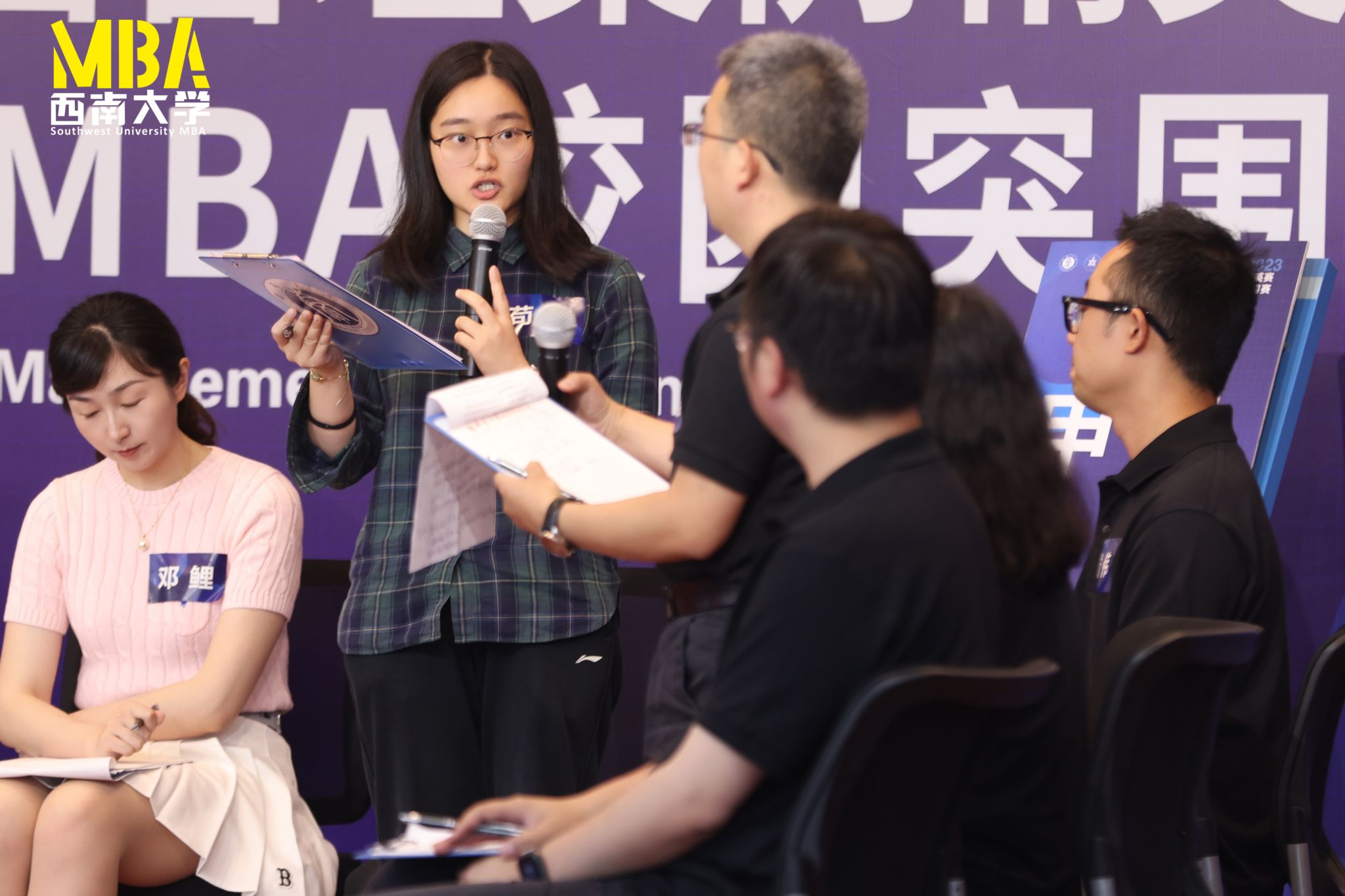 公司邓宗兵教授、刘建新副教授、谭畅副教授、陶雅老师、唐健老师、李宁老师组成B101赛场专家评审团,由邓宗兵教授担任评审团主席并为比赛致辞。B101赛场的主持人是2022级大成班江娅、2022级德合陈诗诗。