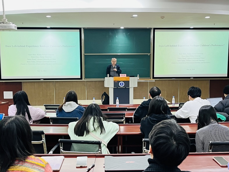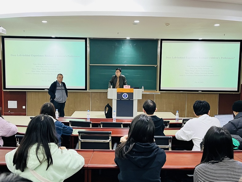 11月24日下午,北京师范大学周晔馨教授应公司邀请,在公司B201开展了题为“留守经历会改变儿童的偏好吗?”的学术讲座。讲座由太阳成tyc7111cc副经理高远东教授主持,公司70余位师生参加了此次讲座。