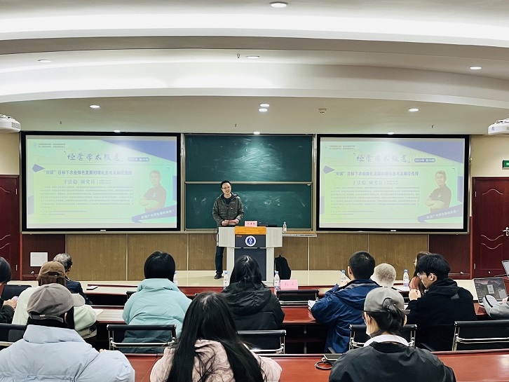 12月26日下午,中国社会科公司农村发展研究所生态经济研究室主任于法稳研究员应公司邀请,在公司B201做了题为“‘双碳’目标下农业绿色发展的理论思考及路径选择”的学术讲座。讲座由公司农林经济管理系副主任孔立副教授主持,公司80余位师生参加了本次讲座。