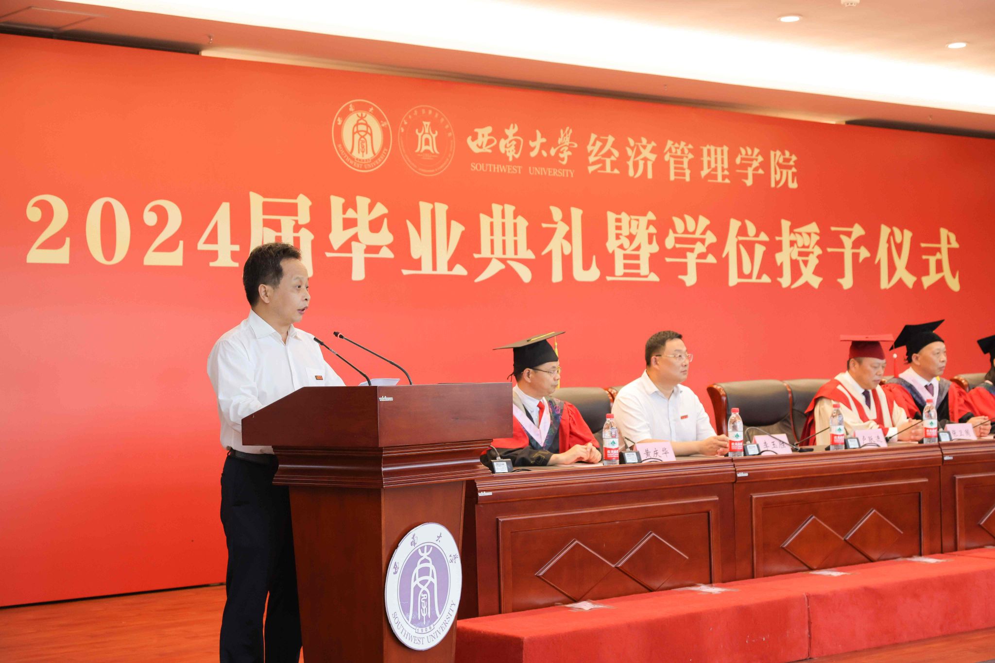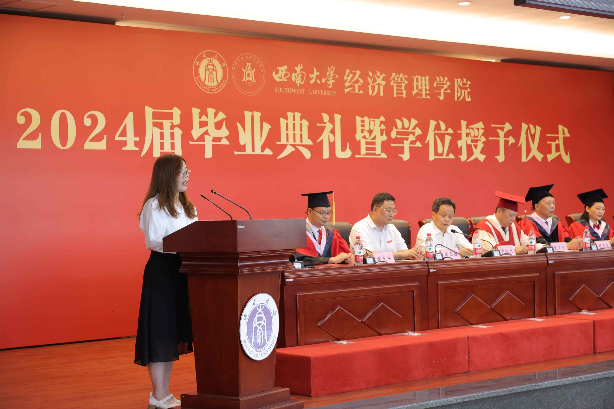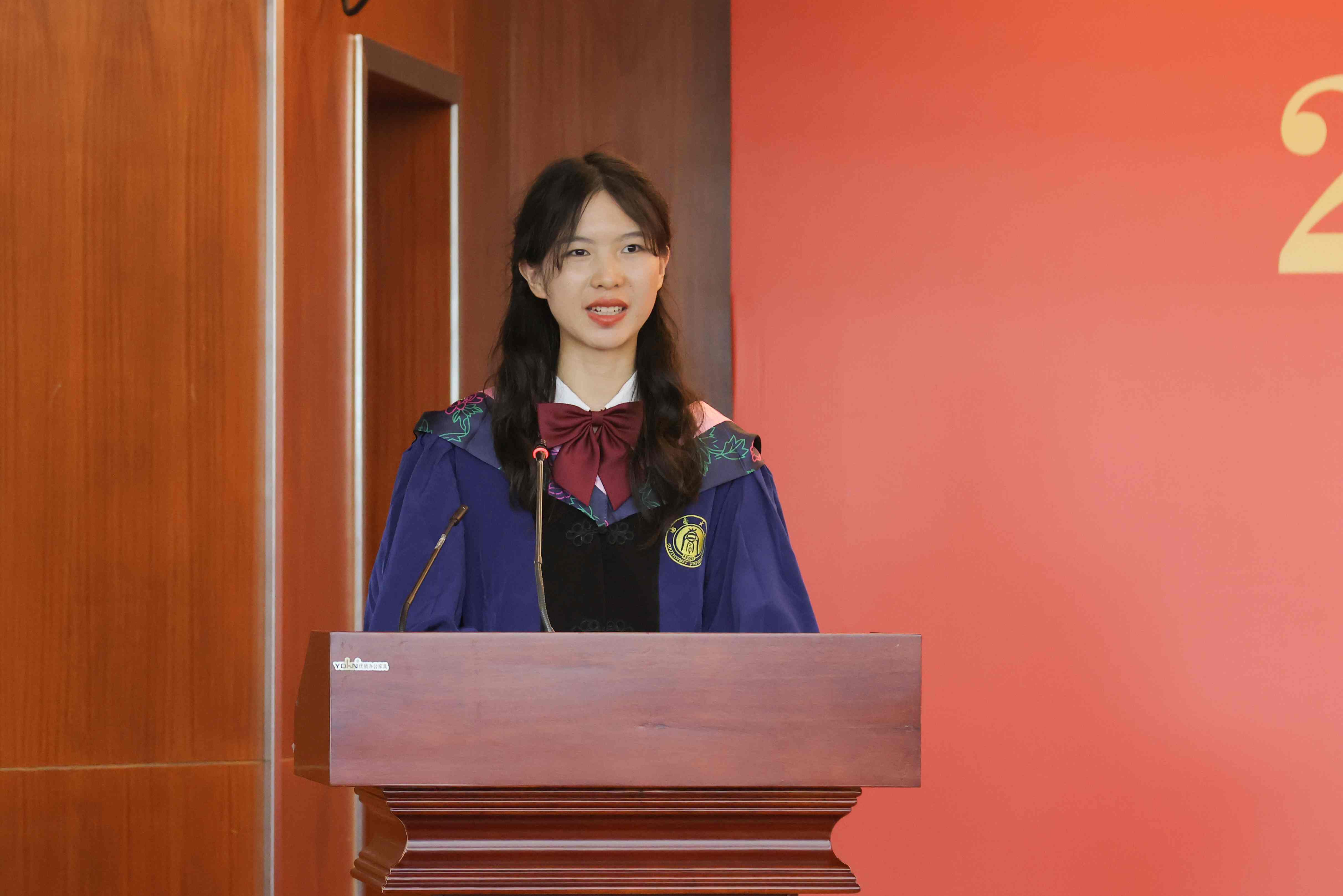 2024届金融学专业袁铭璐作为本科毕业生代表发言,她回顾了四年老员工活的成长与收获,对给予自己指导和帮助的老师、同学及父母表达了深深的感谢,并号召毕业生们带着“含弘光大、继往开来”的校训,带着“特立西南、学行天下”的精神,勇敢踏入社会的洪流,以国家情怀为指导,用实干和担当在实现中国梦的伟大实践中书写属于自己的壮丽篇章。2024届区域经济学硕士和杨亦兰作为毕业研究生代表发言,她回顾了自己“三步并两步走”的难忘求学经历,号召毕业生能够怀揣“不畏艰难,向上破局“的锐气、”不忘初心,向下扎根”的信念,把学术研究书写在祖国大地上,力争与时代同步,将个人梦想与民族复兴紧密连接,做有为的新时代青年。2021级金融学专业本科生蔡滢作为在校生代表发言,她感谢学长学姐给予的耐心指导和帮助,并送上了诚挚的祝福,祝愿他们眼中有光芒,脚下有力量,乘风扶摇三万里,踏歌奋进逐浪高。