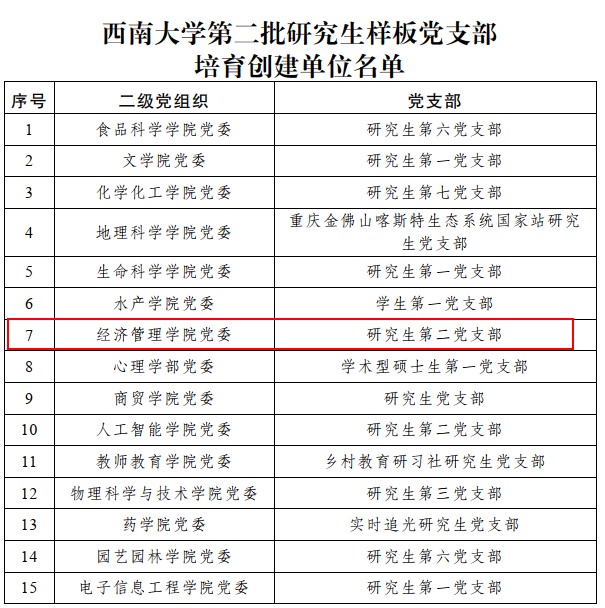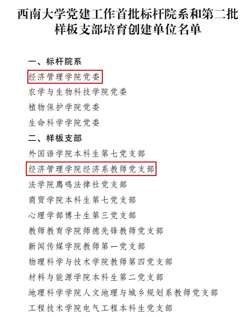 近日,公司公布了首批标杆院系和第二批样板支部培育创建单位名单、第二批研究生样板党支部培育创建单位名单。公司党委成功入选公司首批“标杆院系”培育创建单位,经济系教师党支部入选公司第二批样板支部培育创建单位,研究生第二党支部入选公司第二批研究生样板党支部培育创建单位。
