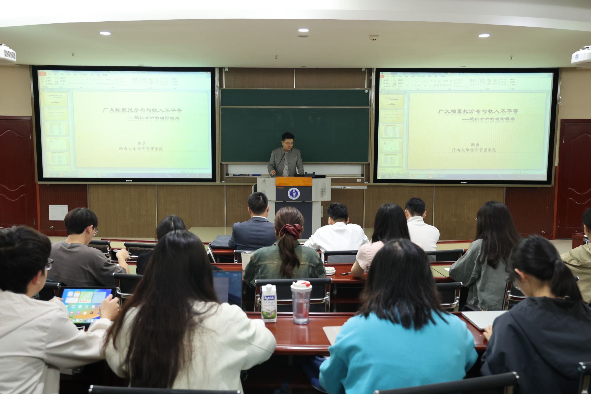 王小华分享了自己从硕士研究生以来的学习经历,鼓励同学们在开展科学研究过程中,坚持守正创新,正视过去,赢得未来。他以《创新和完善宏观调控 推动农民高质量增收》为题,从农民收入增长的时序差异、地区差异、结构差异和内容差异四个方面,深入探讨了农民收入增长的历史事实与现实逻辑,将共同富裕目标下,中国农民高质量增收这一概念进行了系统界定,并指出,未来促进农民高质量增收的宏观政策调控,要牢固树立跨周期调节的理念,进而实现调控目标的长远性、调控政策的连续性和调控方式的系统性。