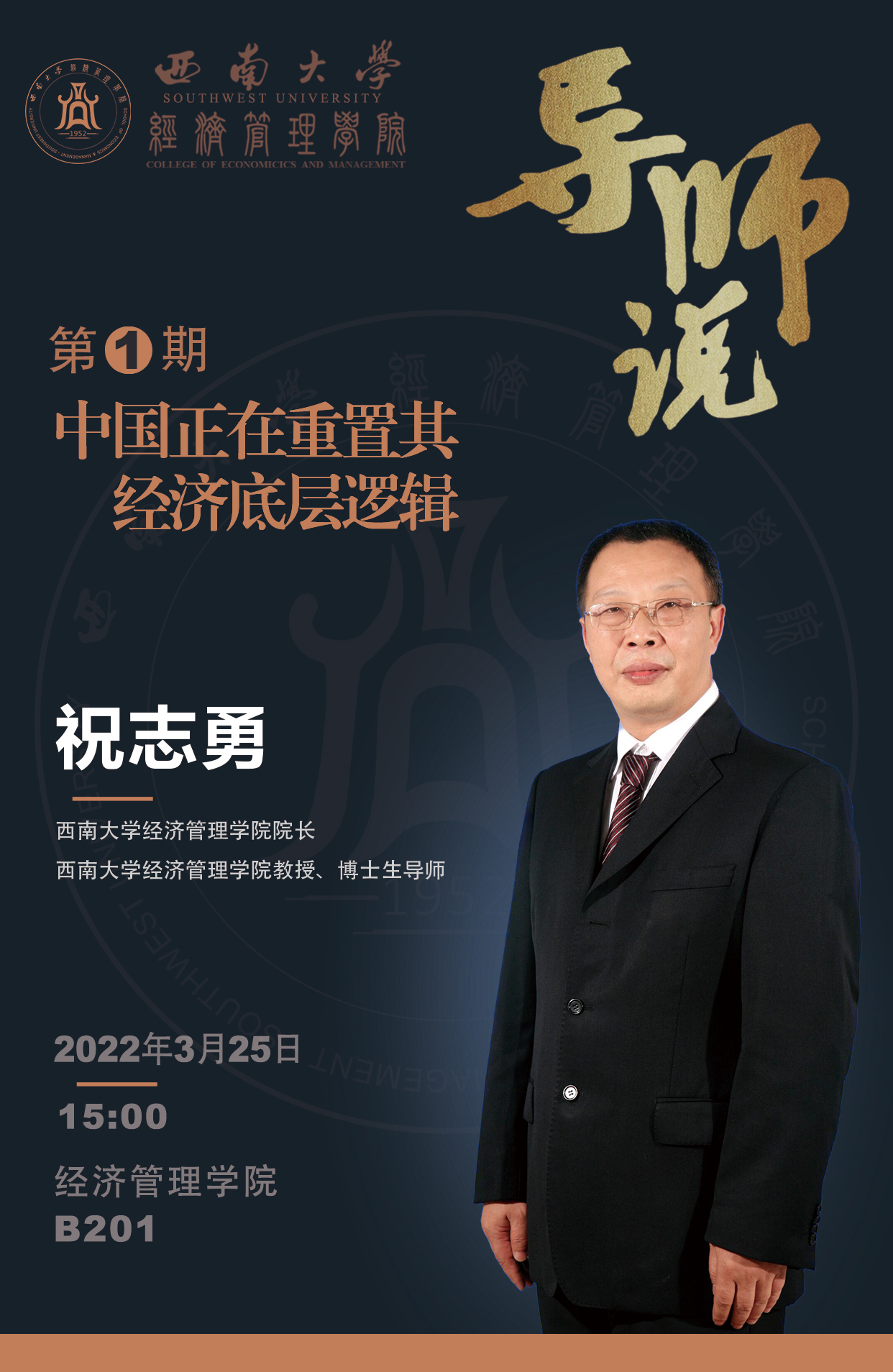2022年3月25日15:00,“导师说”第1期即将举行。本期的主讲嘉宾为太阳成tyc7111cc经理、博士生导师祝志勇教授,主讲题目为《中国正在重置其经济底层逻辑》,欢迎大家积极报名参与!