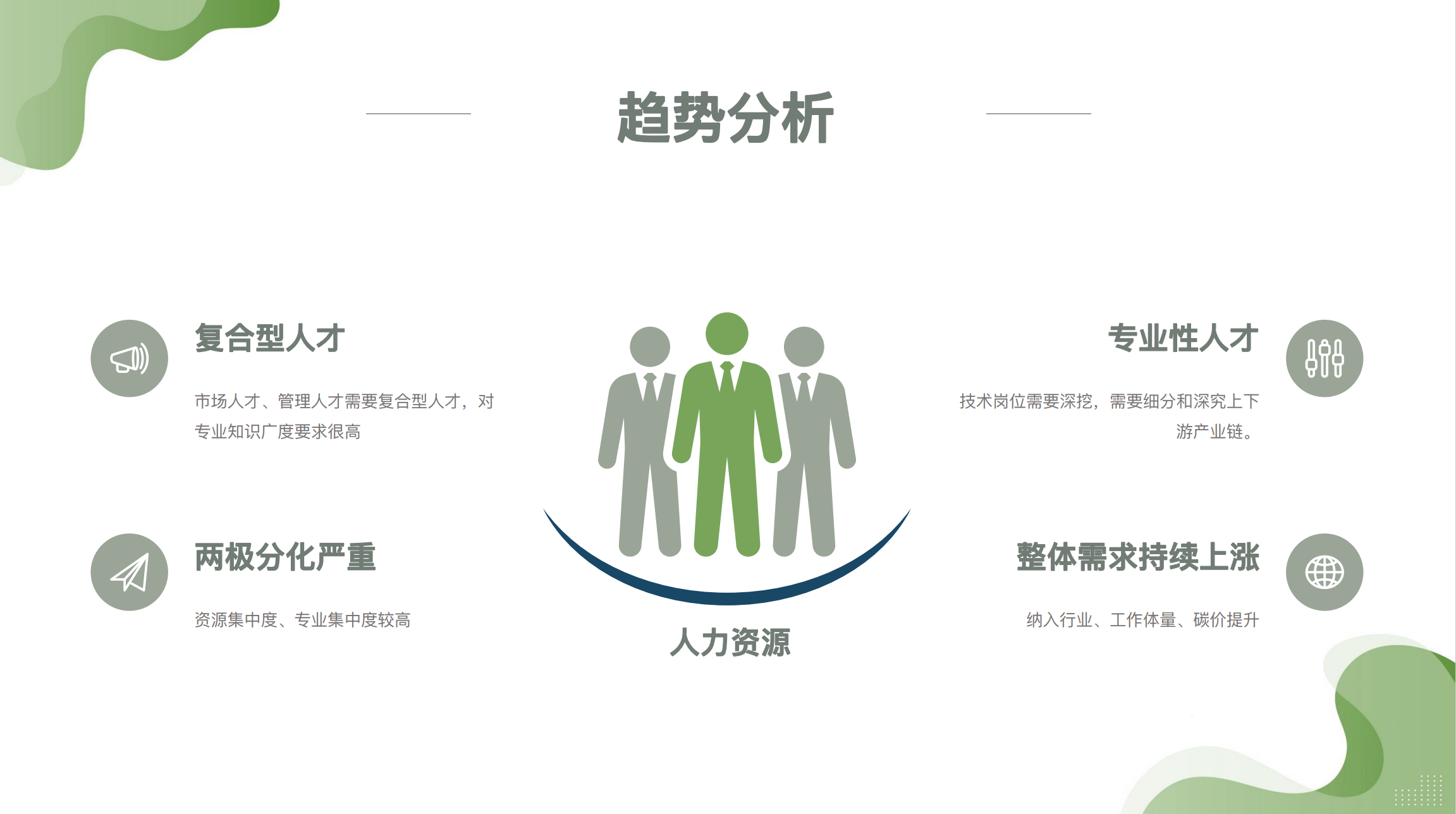 谈到行业人才需求时,周老师依然从四个方面进行了总结:市场和管理都对复合型人才专业知识广度要求极高;和专业性人才有关的技术岗位需要深挖、细分及深究上下游产业链人才;两极分化严重,资源和专业集中度较高;整体需求会随行业发展持续上涨,工作体量、碳价提升都会对此产生影响。