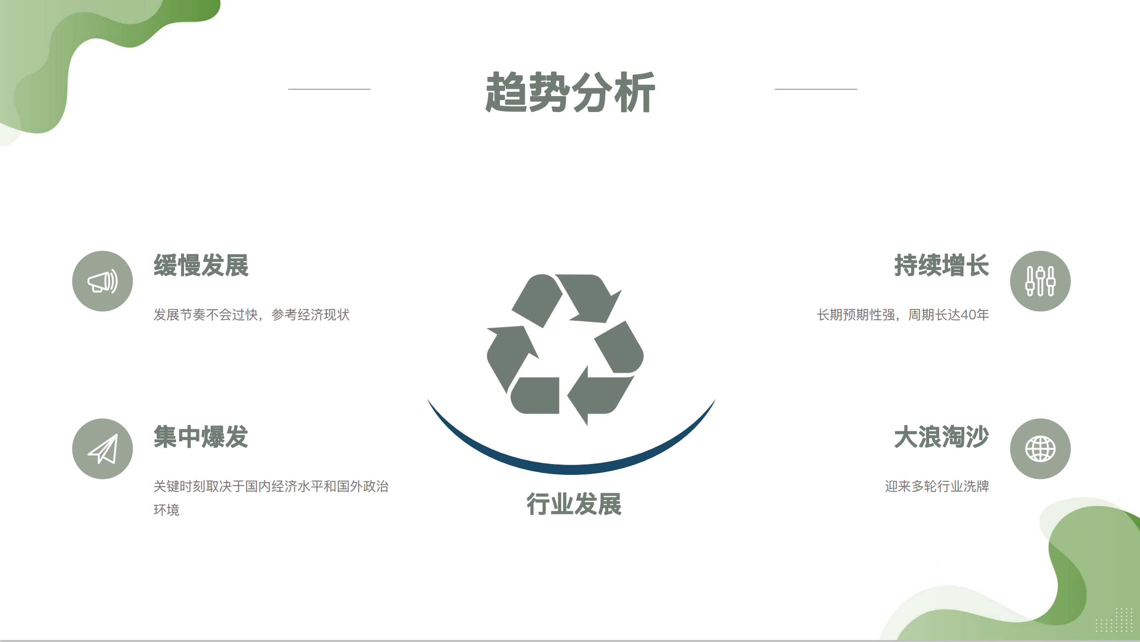 在趋势分析部分,周老师讲到行业发展的四个特质:缓慢发展,发展节奏不会过快;持续增长,周期长达40年;集中爆发,关键时刻取决于国内经济水平和国外政治环境;大浪淘沙,会有多轮行业洗牌发生。