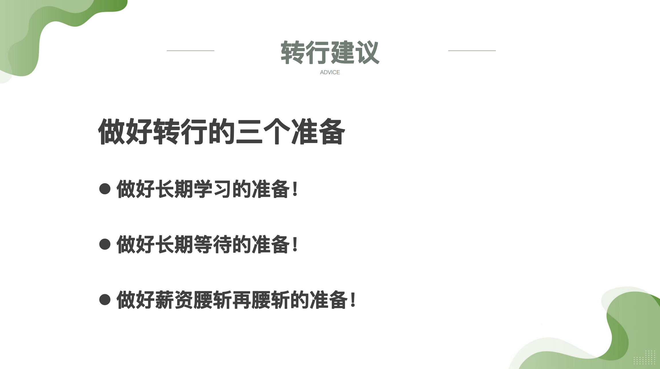 周老师在讲到转行建议时,特别强调——行业对复合型人才的需求更大,所以,在转行时要做好三方面准备:第一,长期学习;第二,长期等待;第三,薪资腰斩再腰斩。接着又围绕建筑、环境、金融、互联网、教培、乡村振兴这几个行业转型的建议分别作了详尽的阐述。