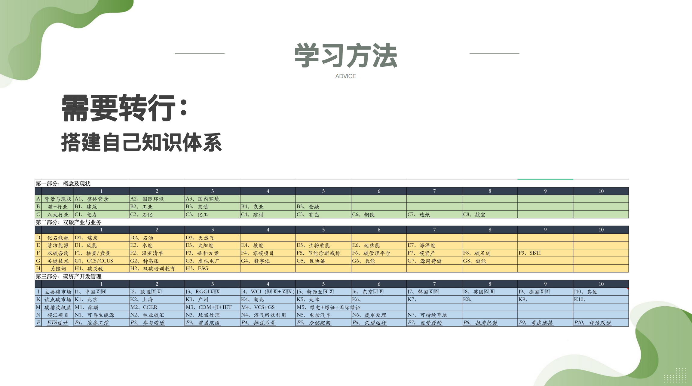 周思佑老师,是北京中创碳投科技有限公司四川分公司市场总监、成都市绿色低碳发展协会专家、碳资产开发与交易研究员。他本次的分享主要围绕行业现状、趋势分析、转行建议、学习方法四个方面进行。