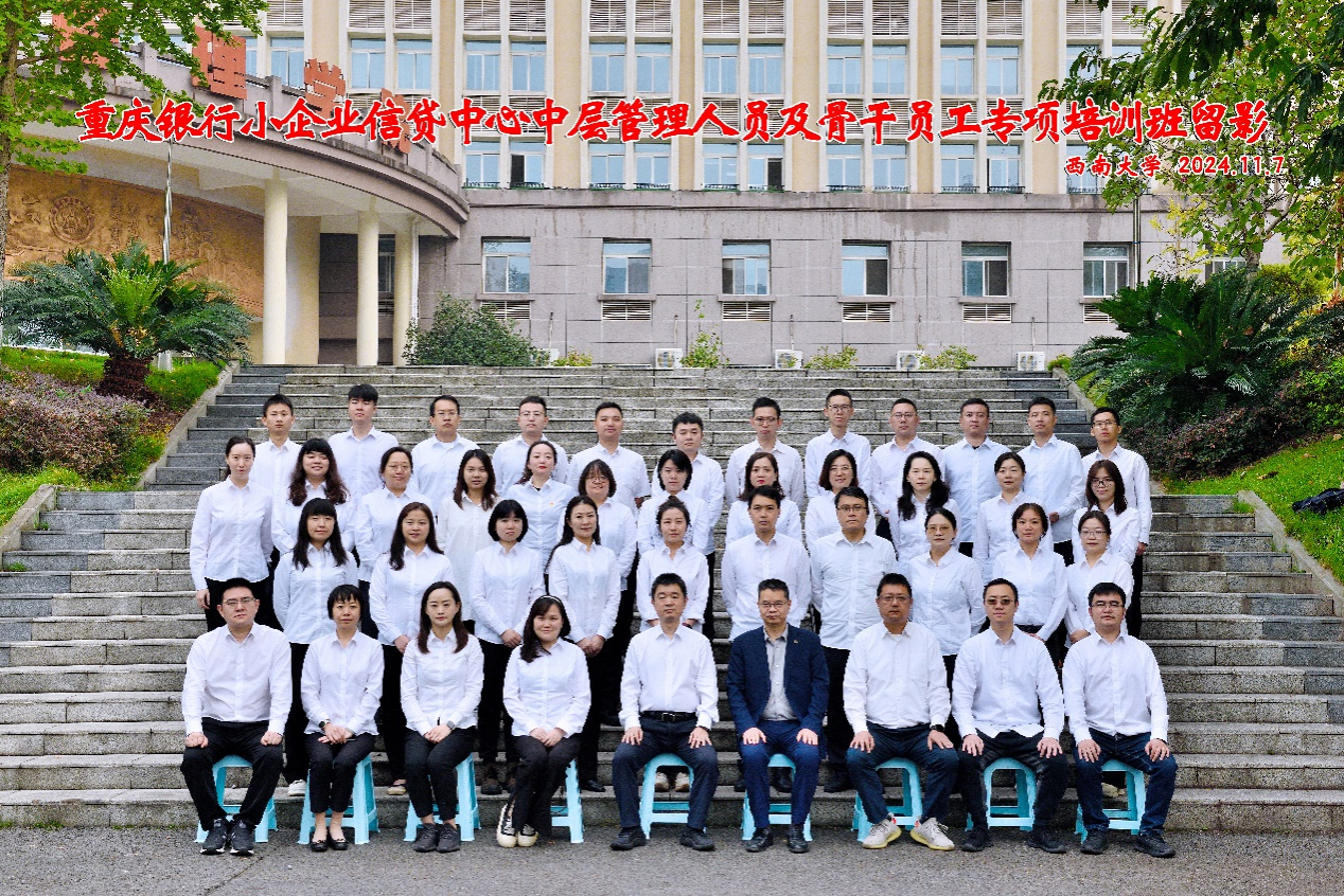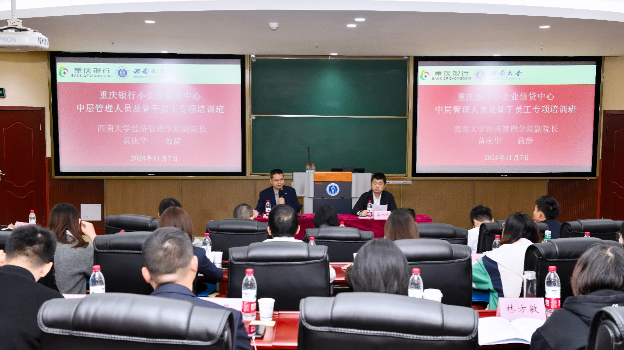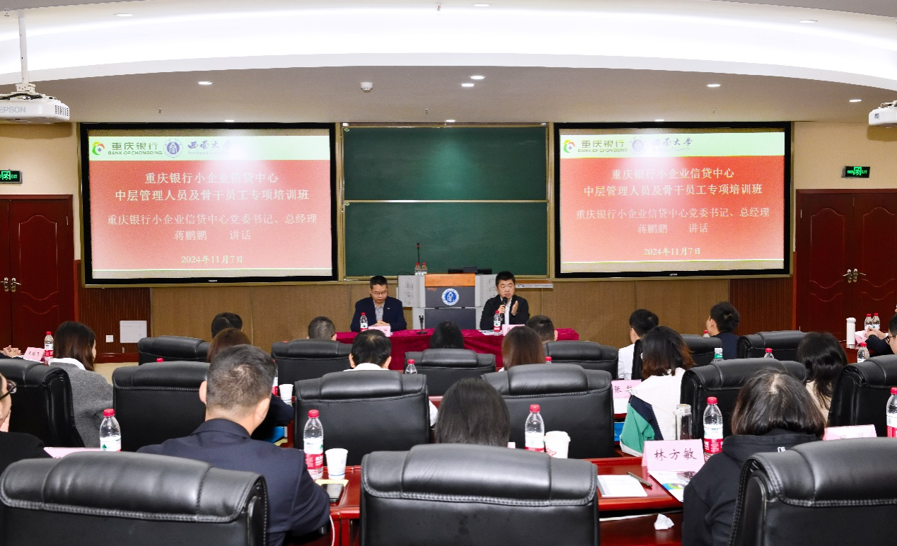 2024年11月7日上午,由重庆银行小企业信贷中心主办、太阳成tyc7111cc高层培训中心承办的“重庆银行小企业信贷中心中层管理人员及骨干员工专项培训班”在公司B301报告厅顺利开班。重庆银行小企业信贷中心党委书记、总经理蒋鹏鹏,太阳成tyc7111cc副经理黄庆华教授,以及培训班全体学员共计40余人出席开班仪式。开班仪式由公司高层培训中心主任苟佳欢主持。
