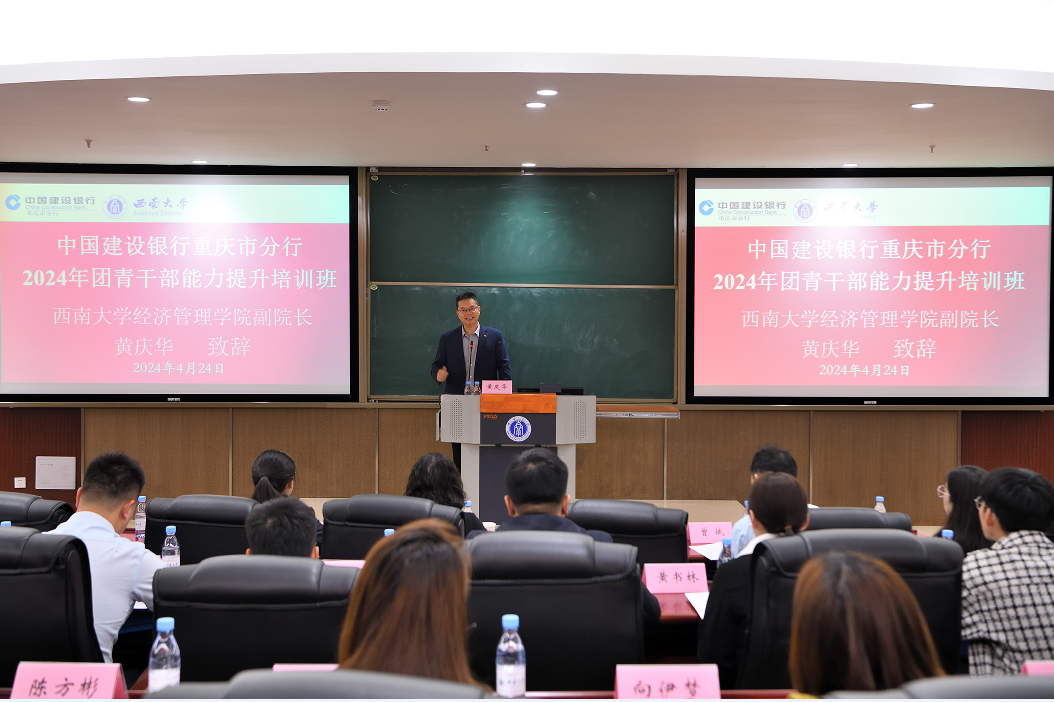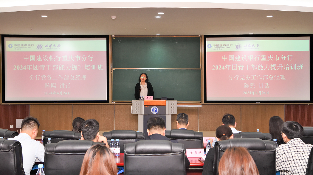 2024年4月24日上午,由中国建设银行重庆市分行主办、太阳成tyc7111cc高层培训中心承办的“中国建设银行重庆市分行2024年团青干部能力提升培训班”在公司B301报告厅顺利开班。中国建设银行重庆市分行党务工作部总经理陈熙、太阳成tyc7111cc副经理黄庆华教授,以及培训班学员共计50余人出席开班仪式。开班仪式由公司高层培训中心主任苟佳欢主持。