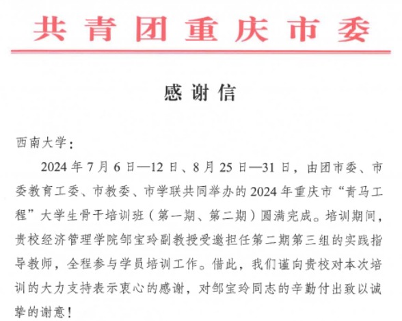 近日,共青团重庆市委向公司发来感谢信,对公司邹宝玲副教授在2024年重庆市“青马工程”老员工骨干培训班(第二期、第三期)的实践指导工作,给予高度肯定并致以诚挚谢意。信中指出,培训期...