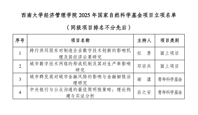 近日,国家自然科学基金委员会发布了《关于2025年国家自然科学基金集中接收申请项目评审结果的通告》。公司共有4个项目成功获批立项,项目获批数创公司历史新高。其中,杜勇教授和邓宗兵教授...